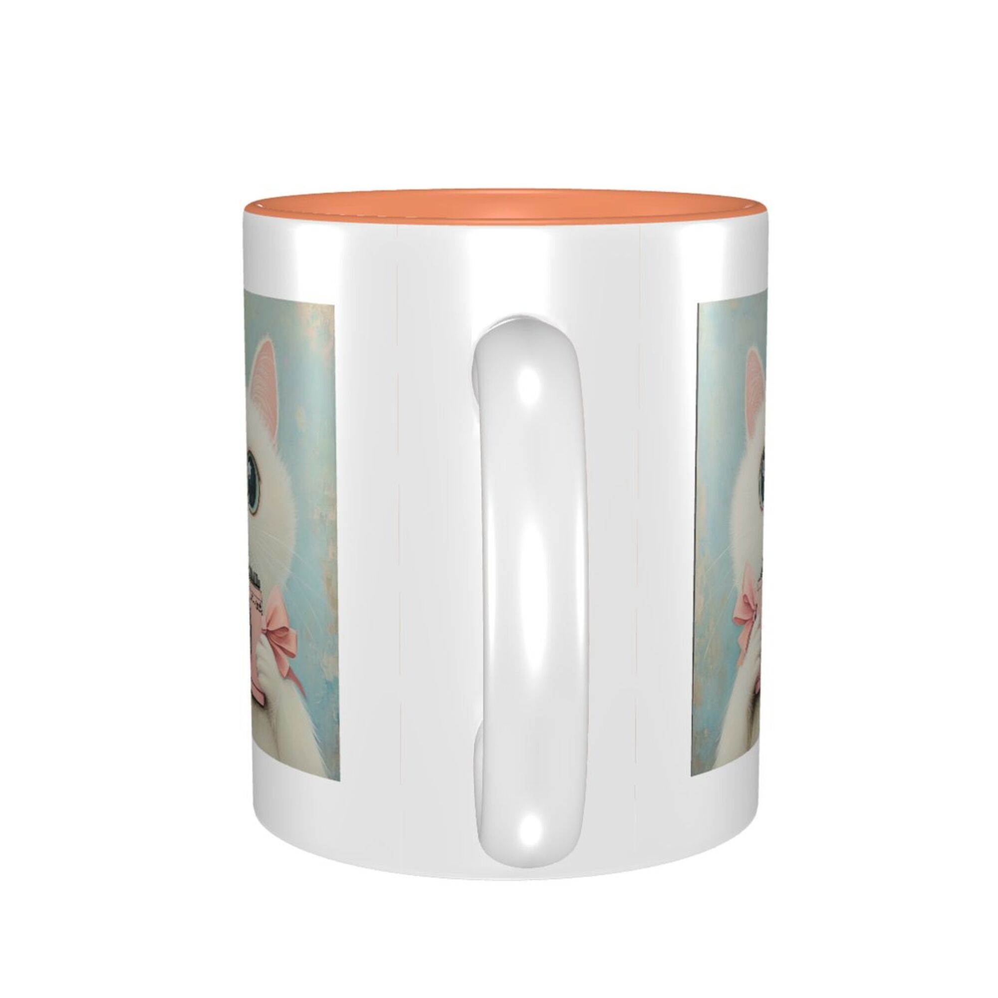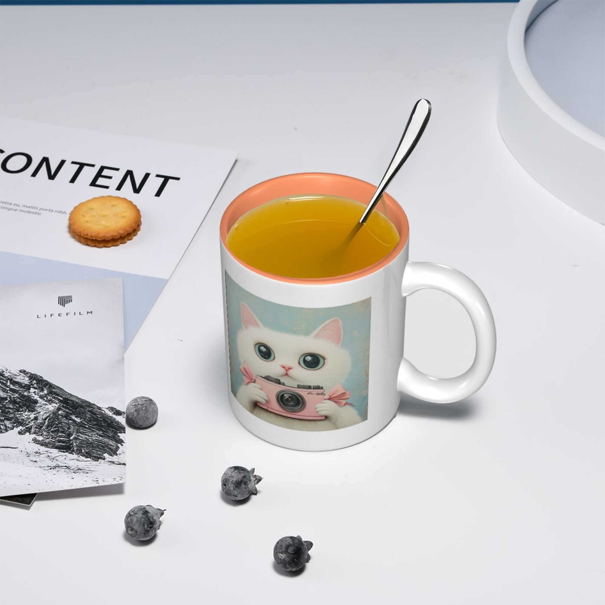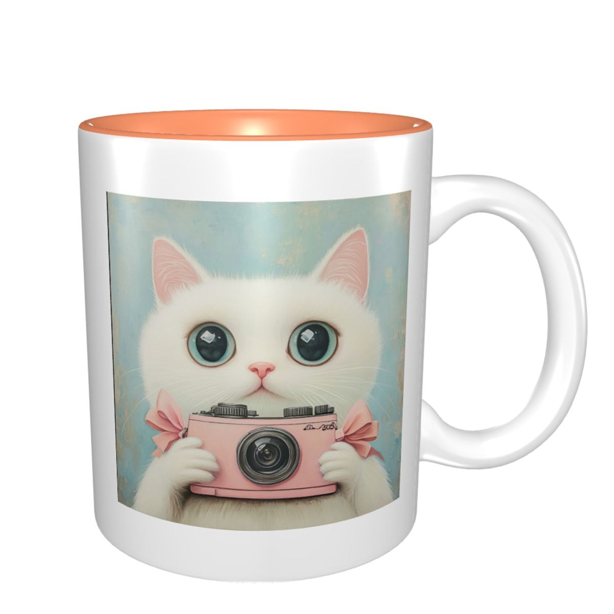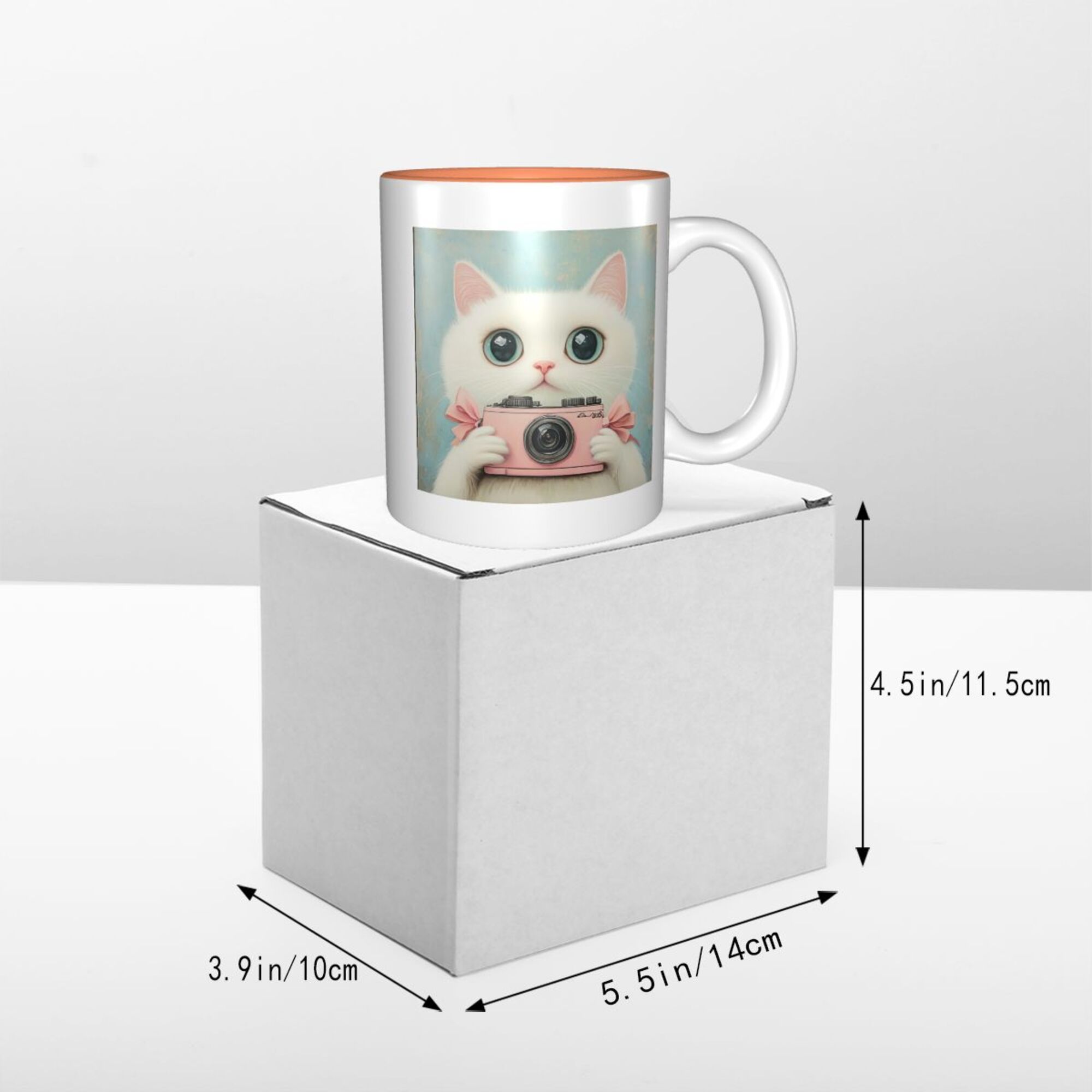 This ceramic mug features an adorable design of a cute cat holding a vintage camera, as if caught in the moment of taking a picture. The cat's bright, curious eyes and the overall playful vibe bring a sense of warmth and charm to the design. The interior of the mug is finished in orange, creating a striking contrast with the blue background and the cat's pink bow, adding a touch of style.