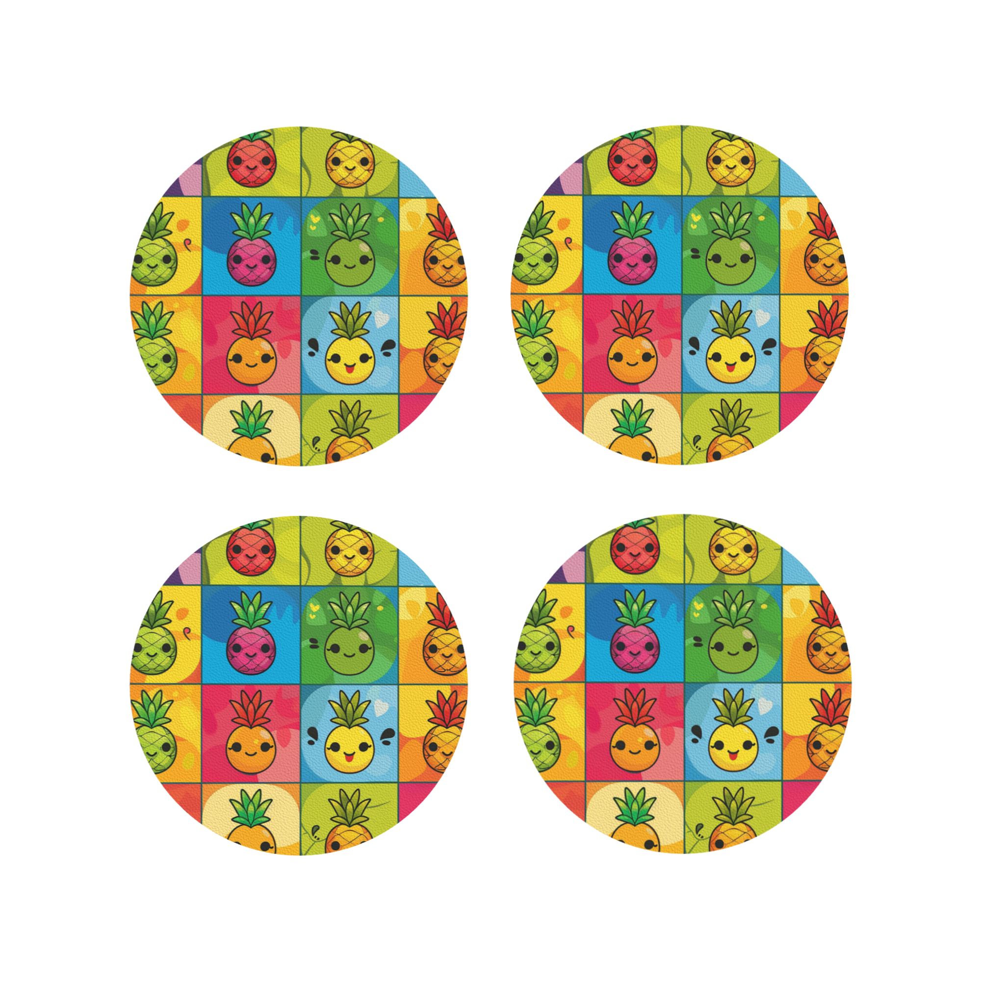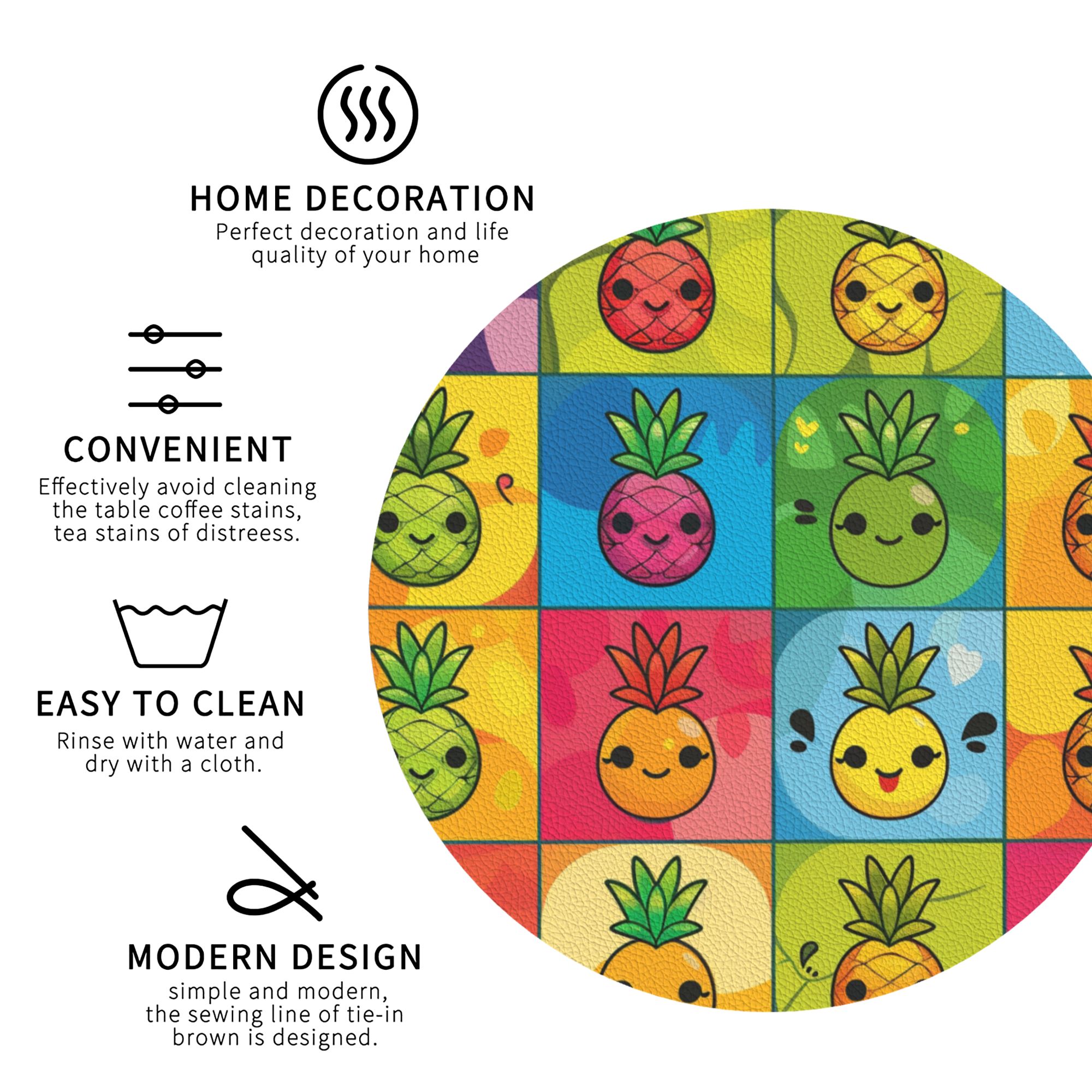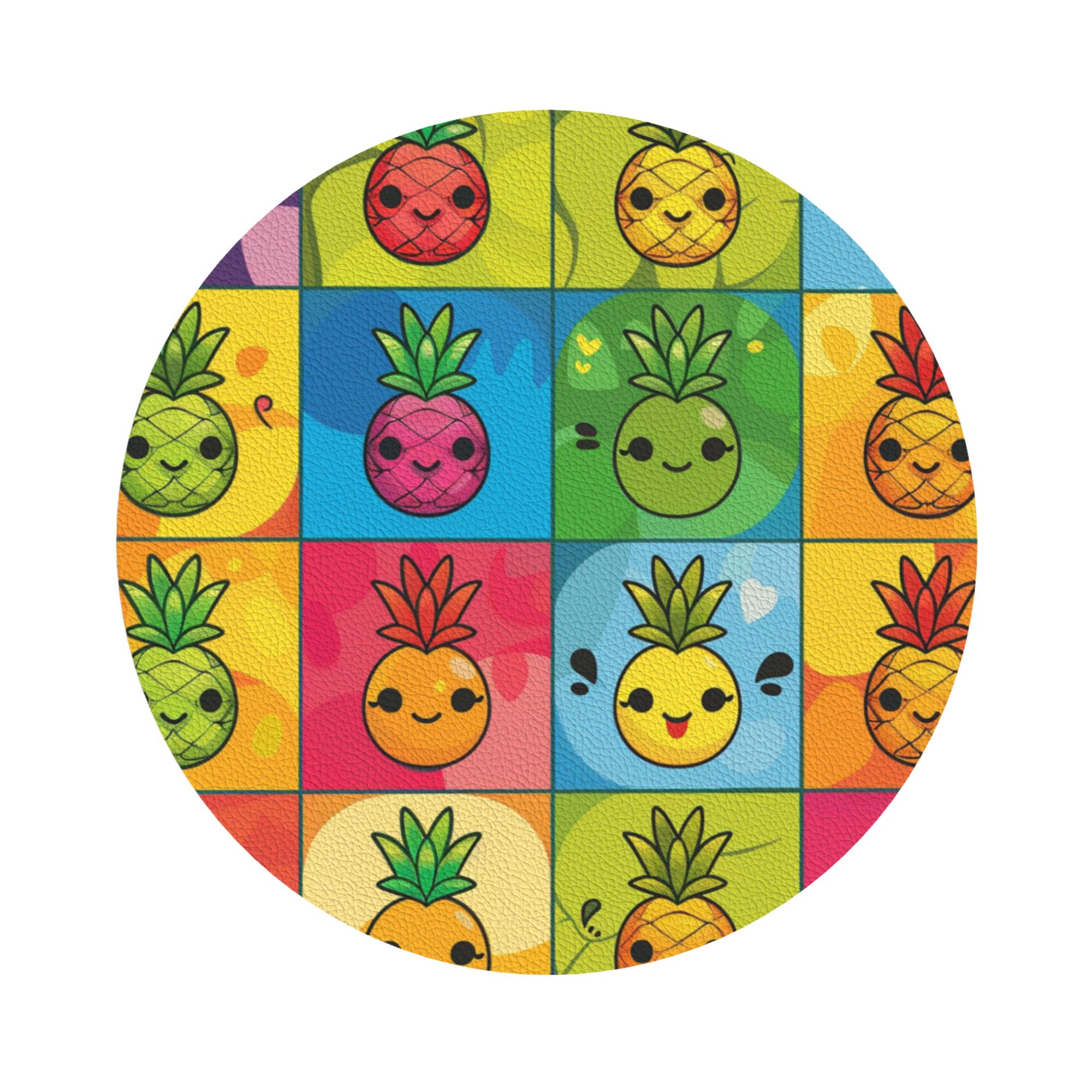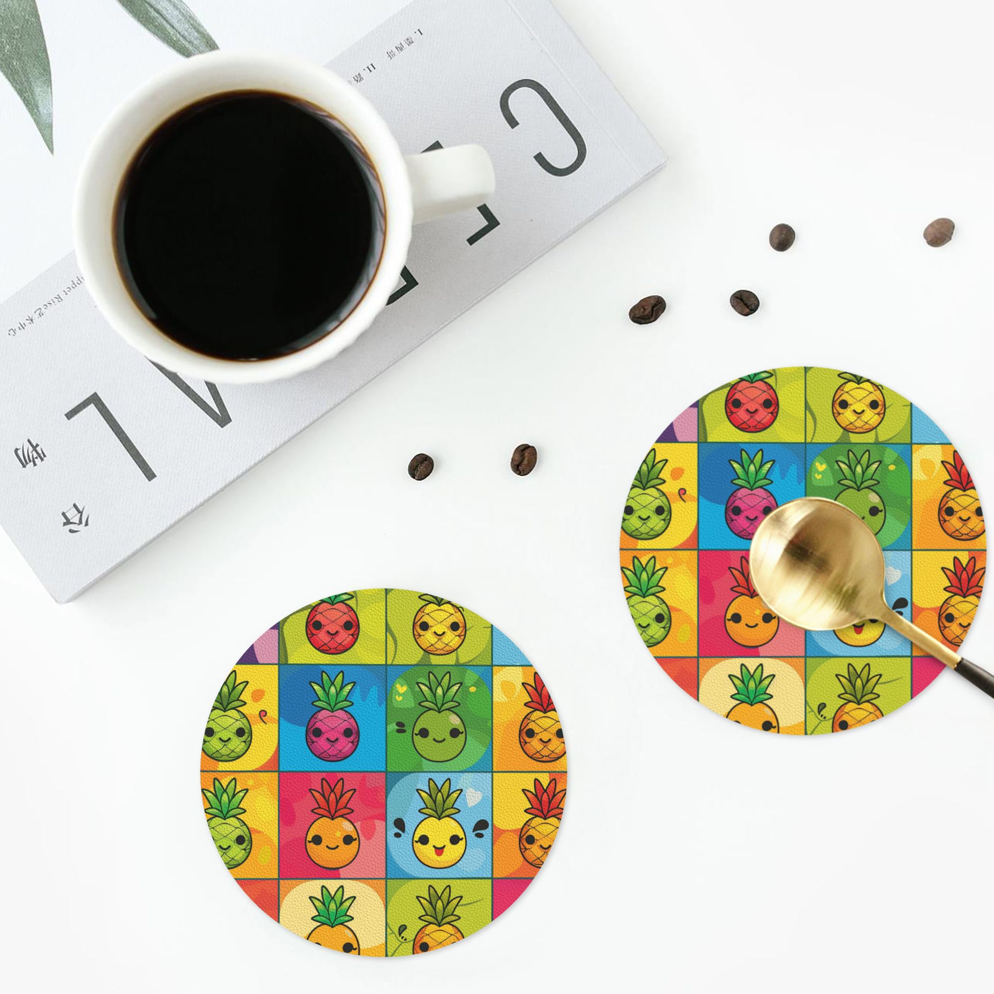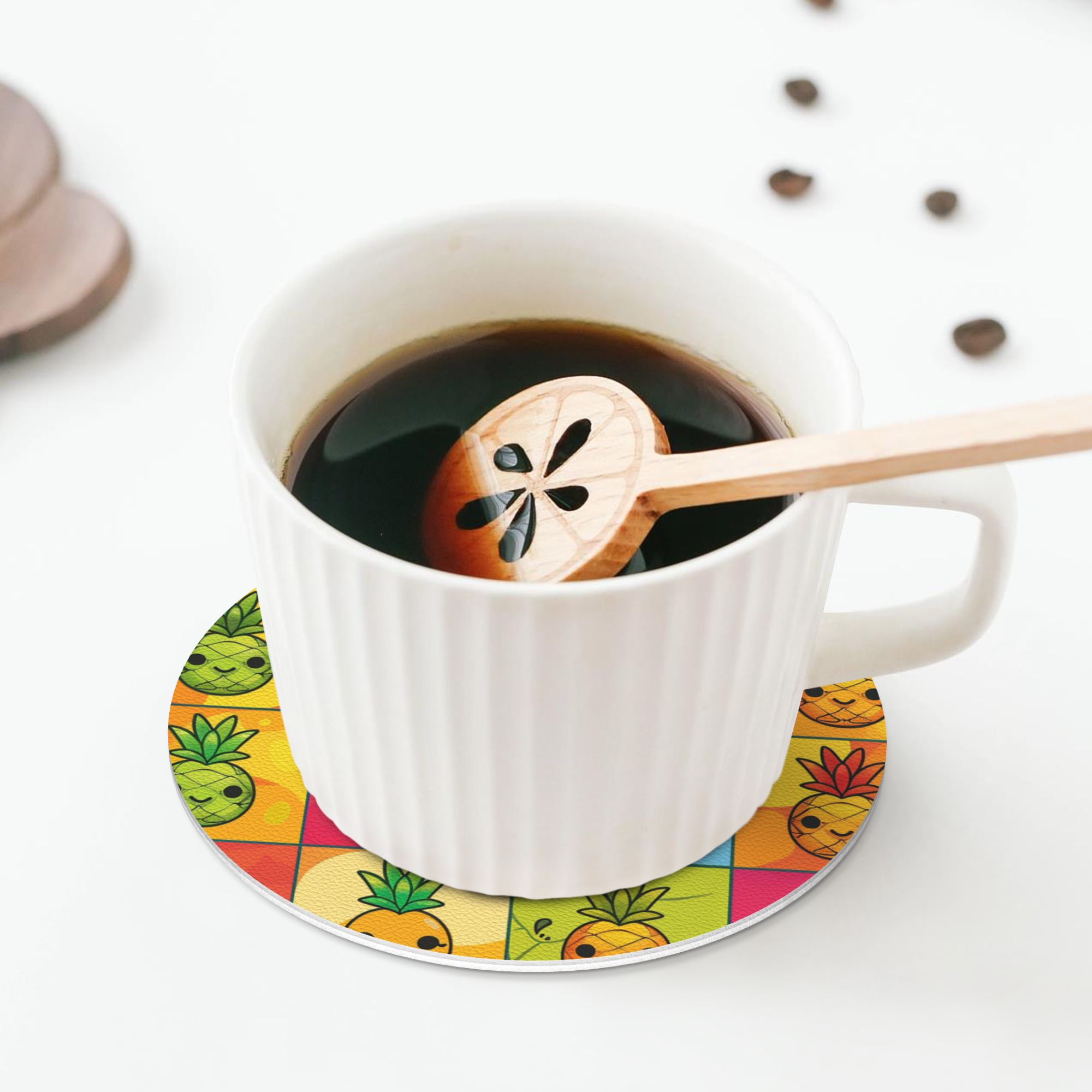 This round ceramic coaster features a playful design with a series of cute, colorful pineapple patterns. Each pineapple showcases different colors and facial expressions, adding a touch of fun and visual appeal to this coaster, making it an ideal decorative piece for your home, office, or café. This coaster is not only practical but also highly decorative, bringing joy and color to your space.