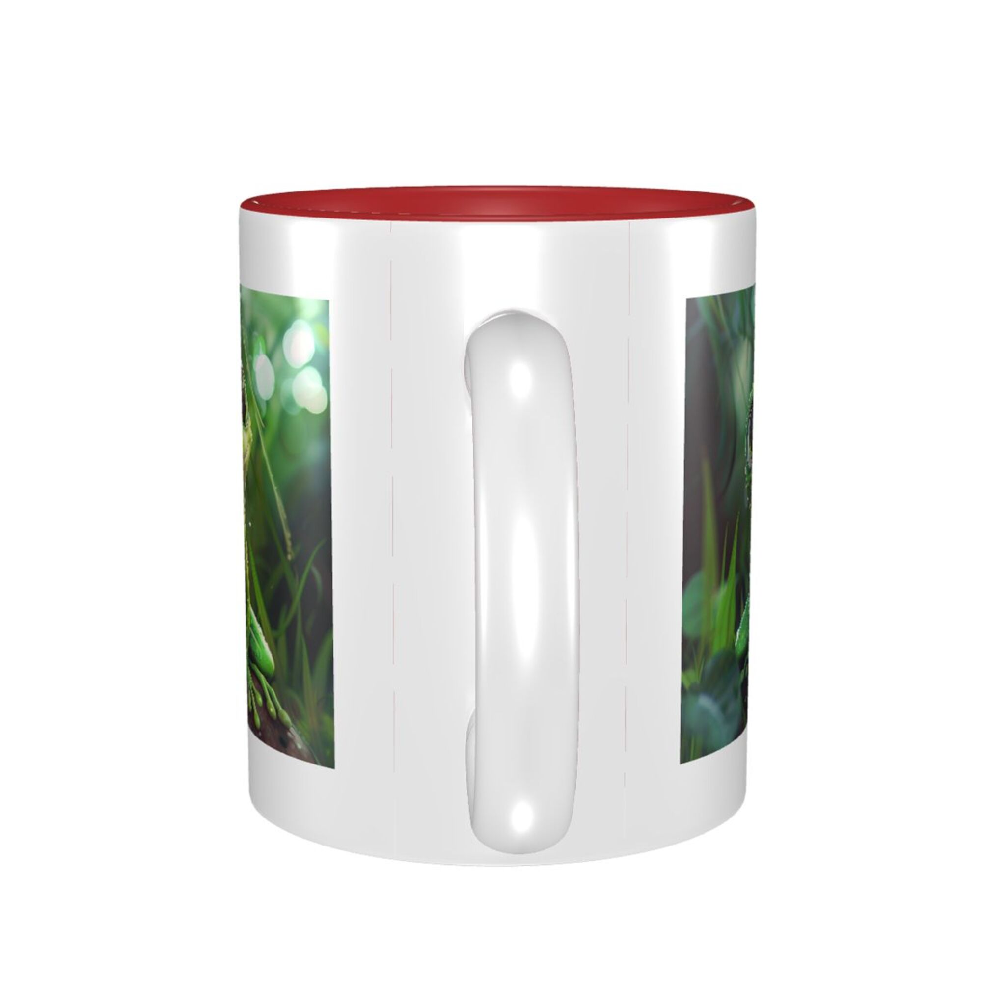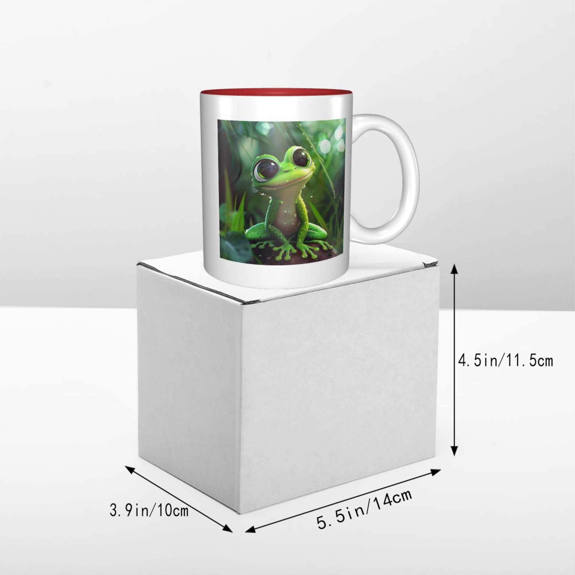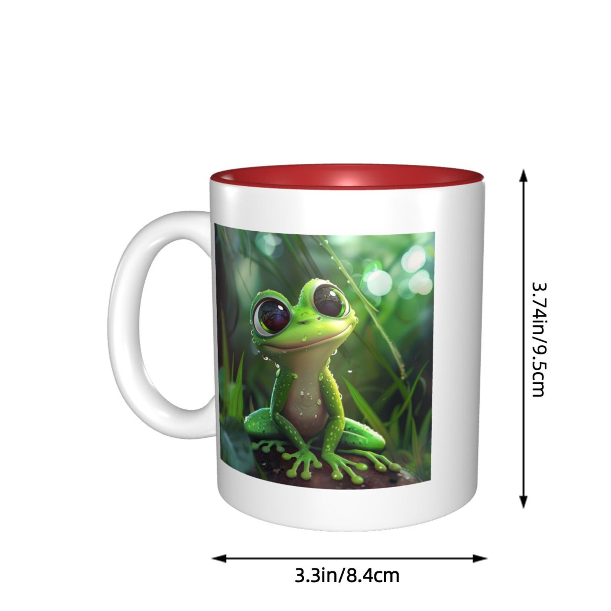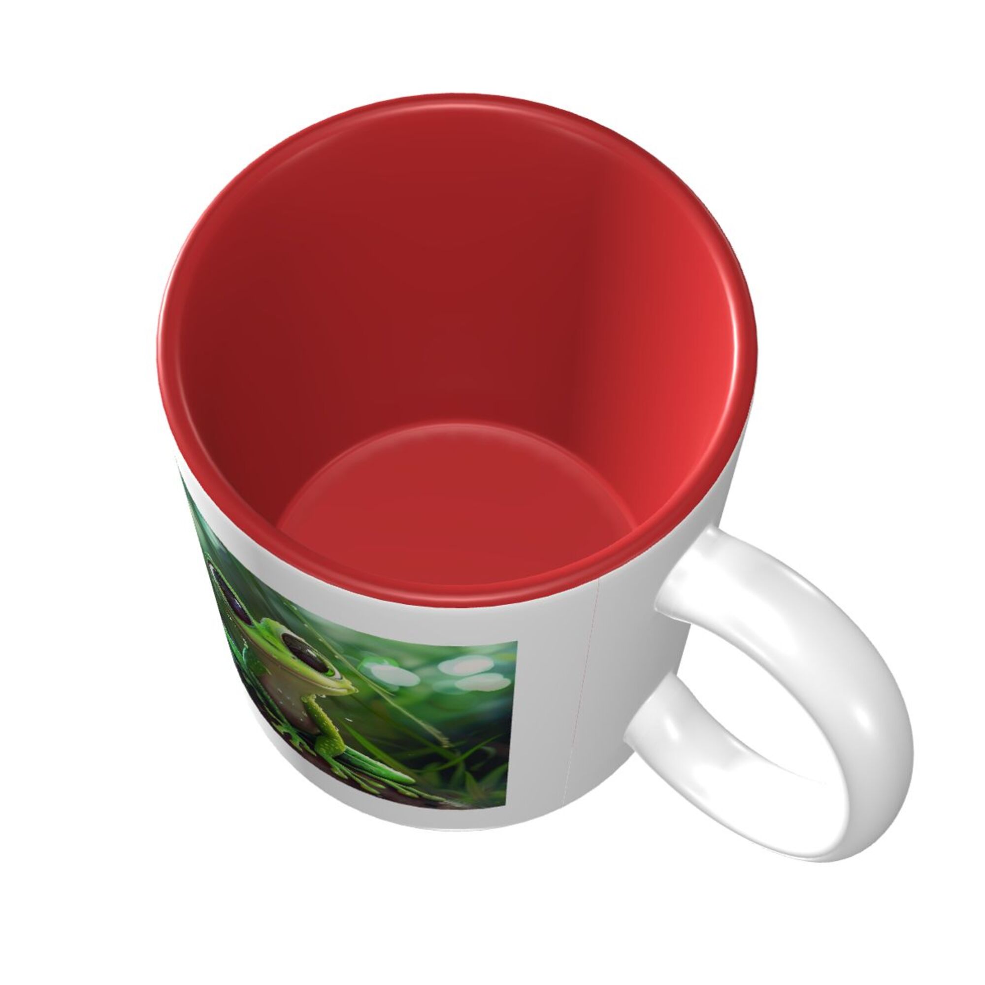 This ceramic mug features an adorable design of a cute frog, vividly depicted with large, bright eyes that seem to gaze right at you. The frog is surrounded by a lush, green natural background, creating a fresh and lively atmosphere. The interior of the mug is finished in deep red, contrasting sharply with the green exterior, adding a unique visual appeal.