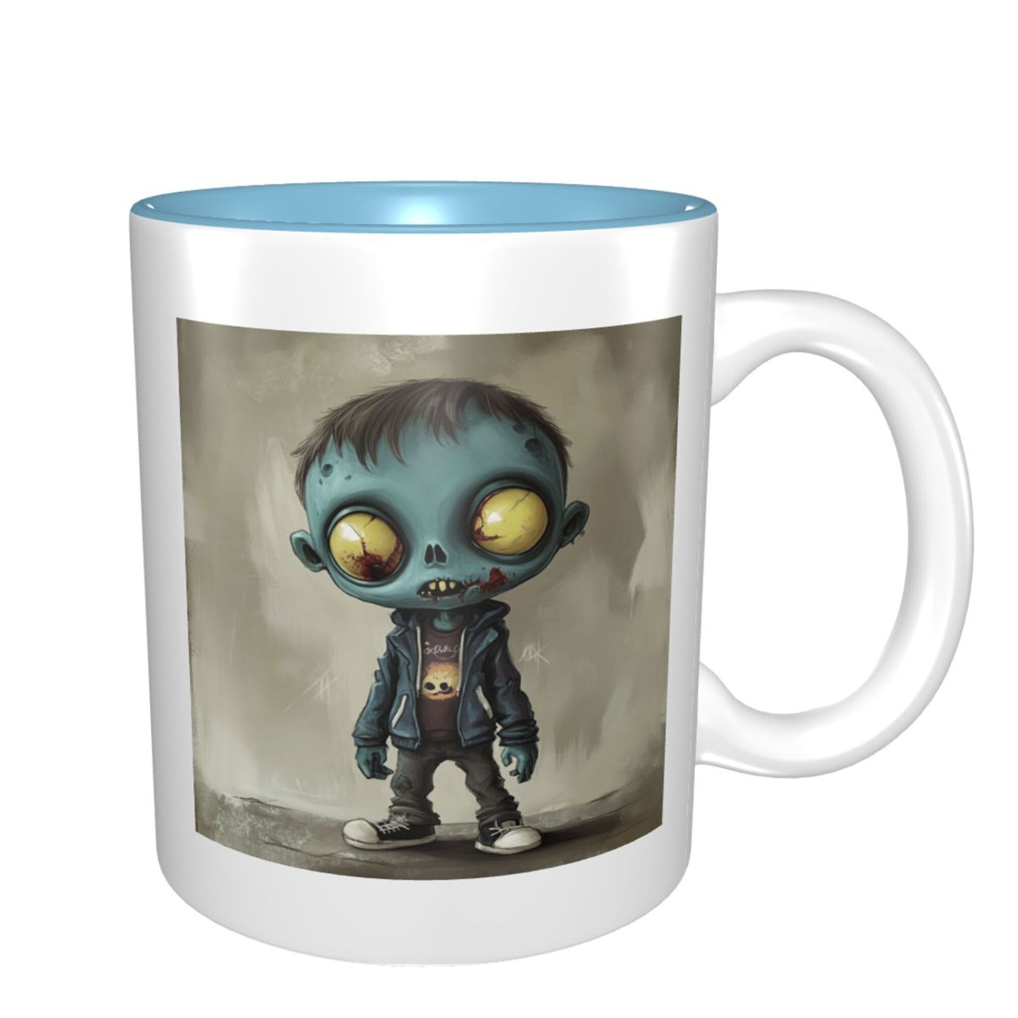 his ceramic mug features an adorable zombie design, making it the perfect choice for anyone who loves unique designs. Made from high-quality ceramic, the mug offers excellent heat retention and durability, making it ideal for everyday use. The interior is a smooth blue color, adding a fresh touch that complements the zombie graphic on the outside. With a capacity of 11 oz (approximately 325 ml), this mug is perfect for holding a large cup of coffee, tea, or other beverages, making it your ideal morning companion. Whether for personal use or as a gift for a friend, this uniquely designed ceramic mug is sure to impress.