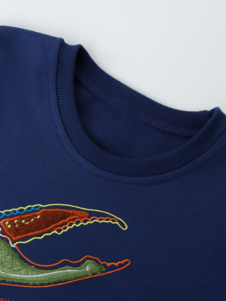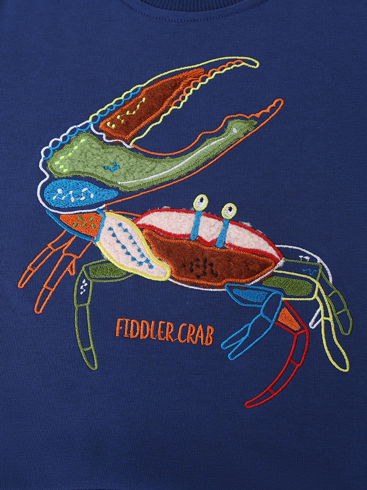 This kids’ crewneck sweatshirt features a fun crab-themed embroidered design, bringing a playful and artistic touch to everyday outfits. The colorful embroidery adds character while keeping a clean and stylish overall look, perfect for daily wear.