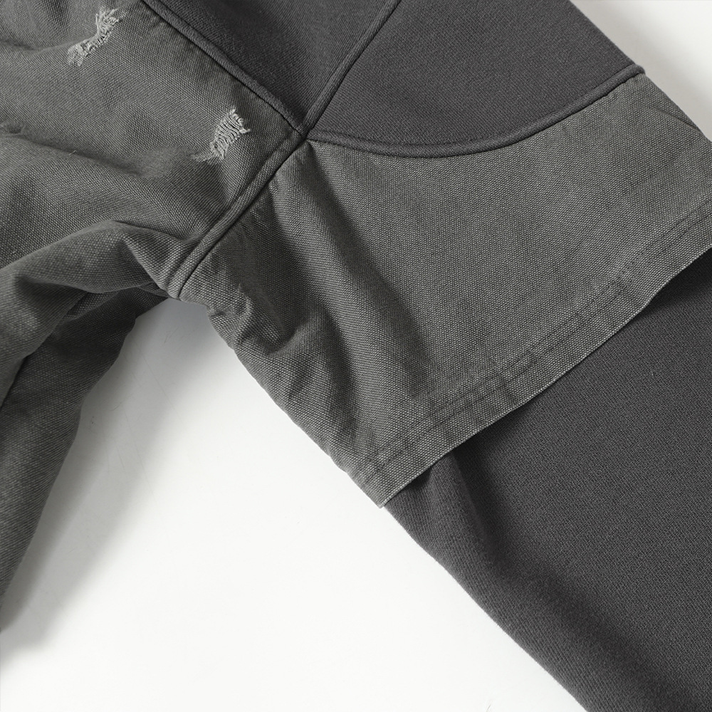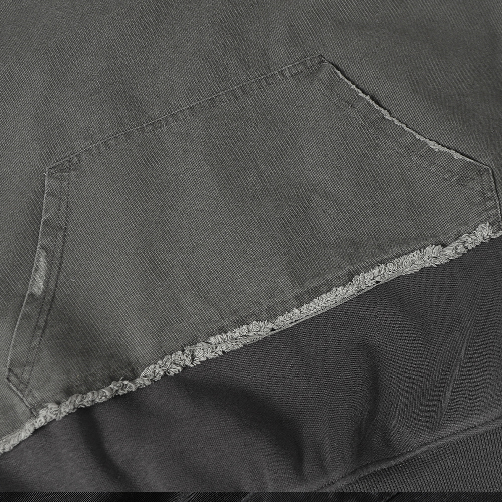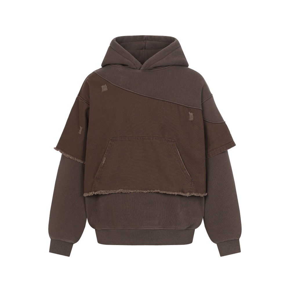 Crafted from soft cotton fabric, the hoodie is breathable, skin-friendly, and suitable for all-season wear. The unique patchwork construction, distressed details, and raw-edge finishing enhance the overall design, giving it a trendy and edgy appeal. The hooded design adds practicality by providing extra warmth and wind protection while elevating the overall silhouette.