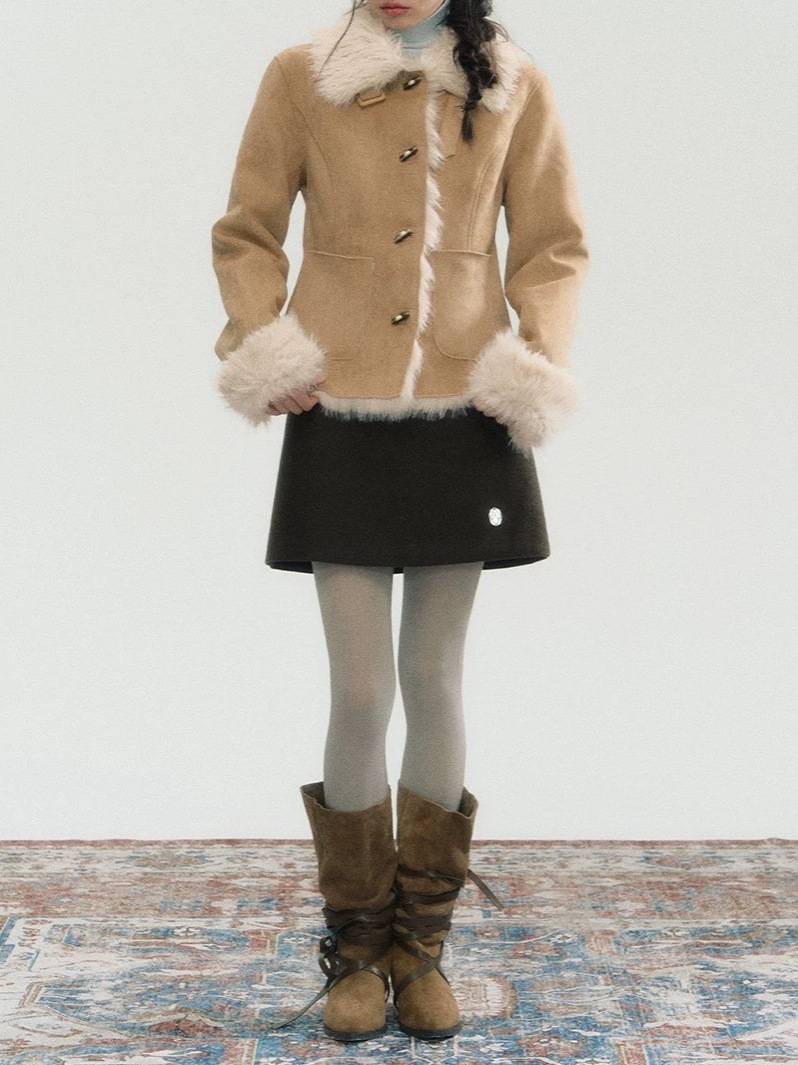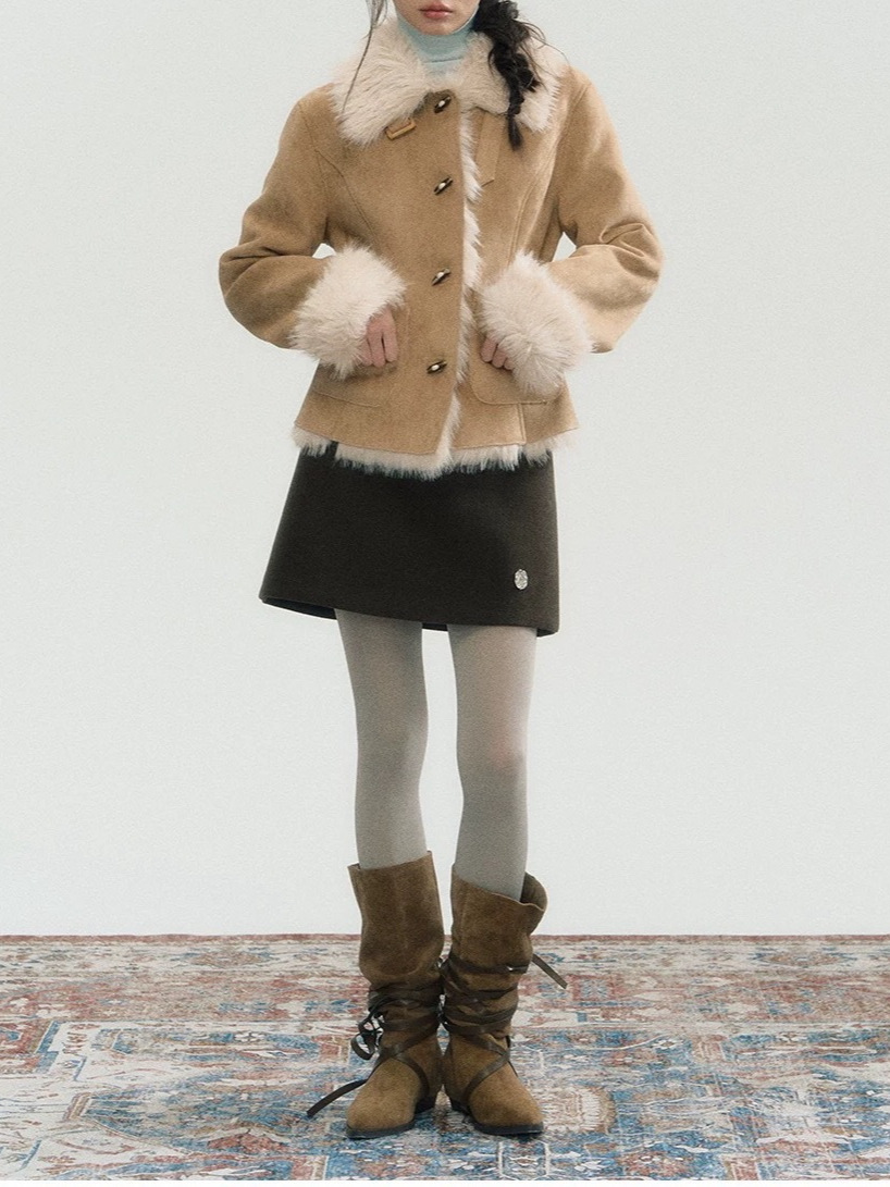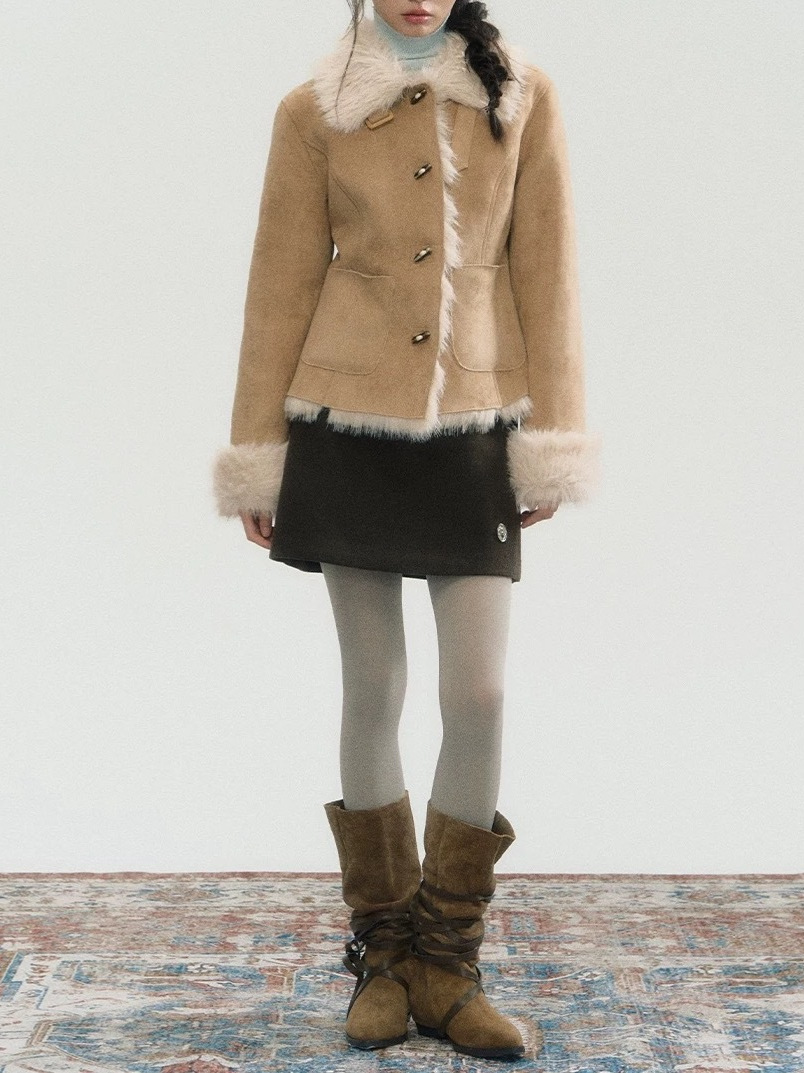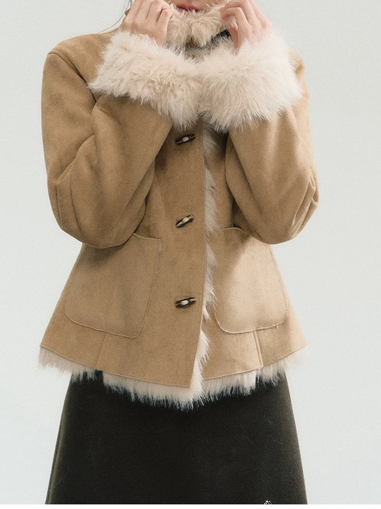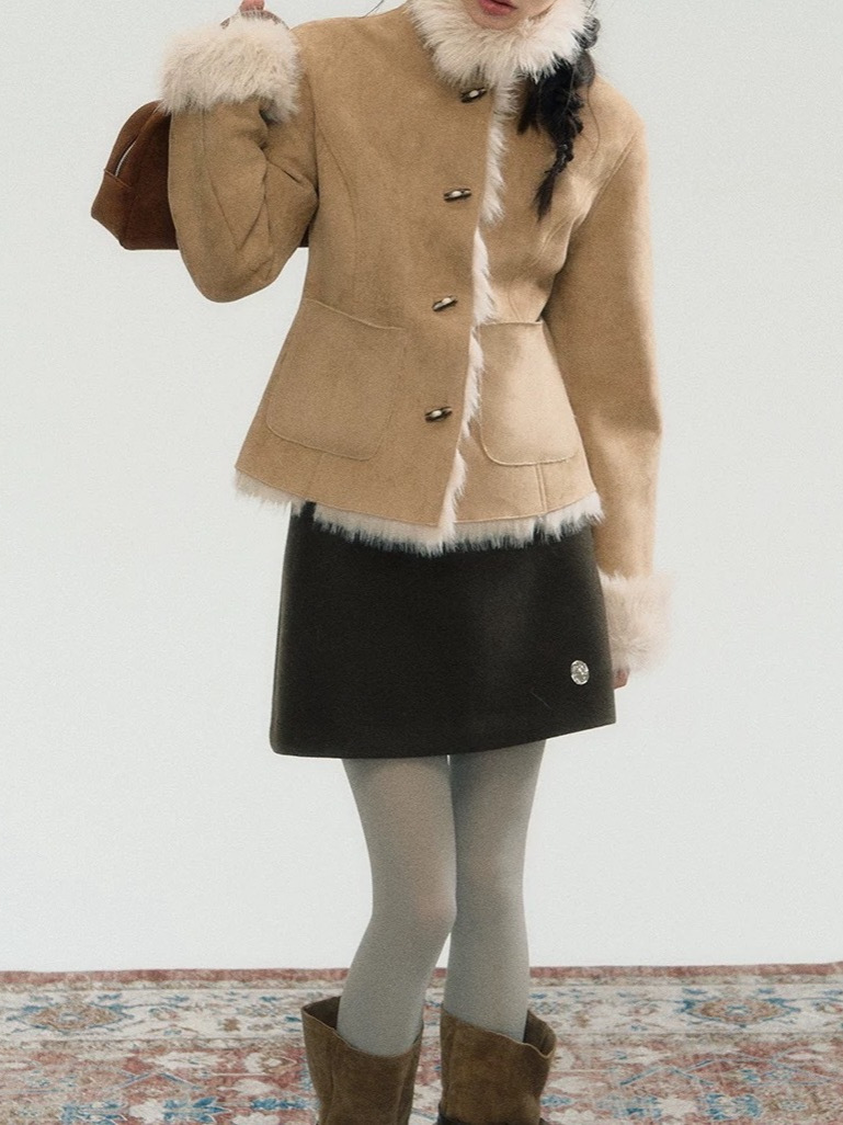 Plush faux fur trims along the collar, front placket, and cuffs provide enhanced warmth and a luxurious feel. The short-length silhouette with a subtle fitted shape flatters the body and creates a clean, balanced proportion without adding bulk. A classic button-front closure adds both functionality and visual appeal.