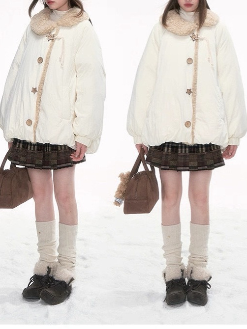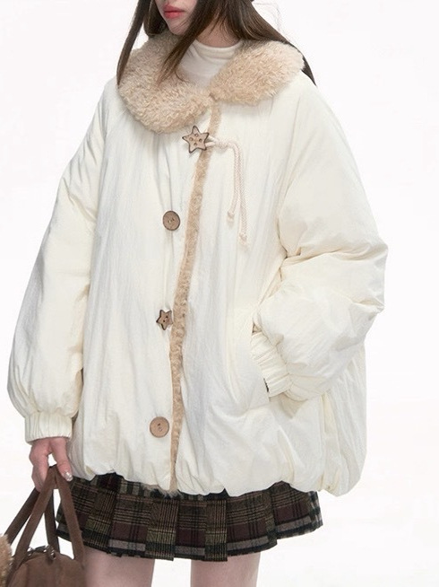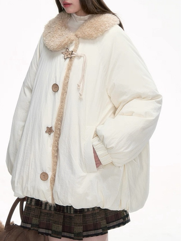 The jacket is finished with plush faux fur trim along the collar and front placket, providing extra warmth and a refined texture. Decorative star-shaped buttons add subtle charm and elevate the overall look. The short-length cut creates a flattering proportion, making it easy to pair with skirts, dresses, or casual pants.